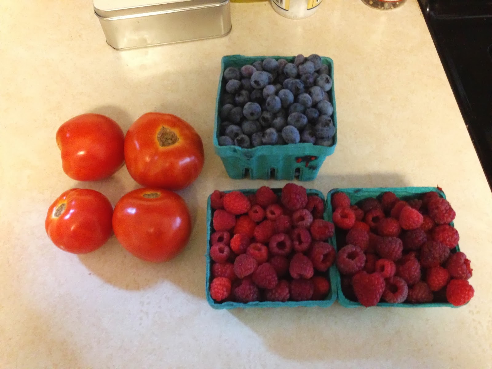 On the way back from the farm I stopped at a little farmer's market and got some blueberries, raspberries and tomatoes. I was really excited to dig into this food!