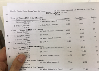 I had been talking recently with the coach that leads the masters workout where I swim about the idea of swimming in a masters meet. Unlike running or other sports that has a clear age definition of what is "masters" - for swimming, I believe it generally just means swimming for adults. The idea of competing in a meet was exciting and nerve-wracking to me for a few reasons.